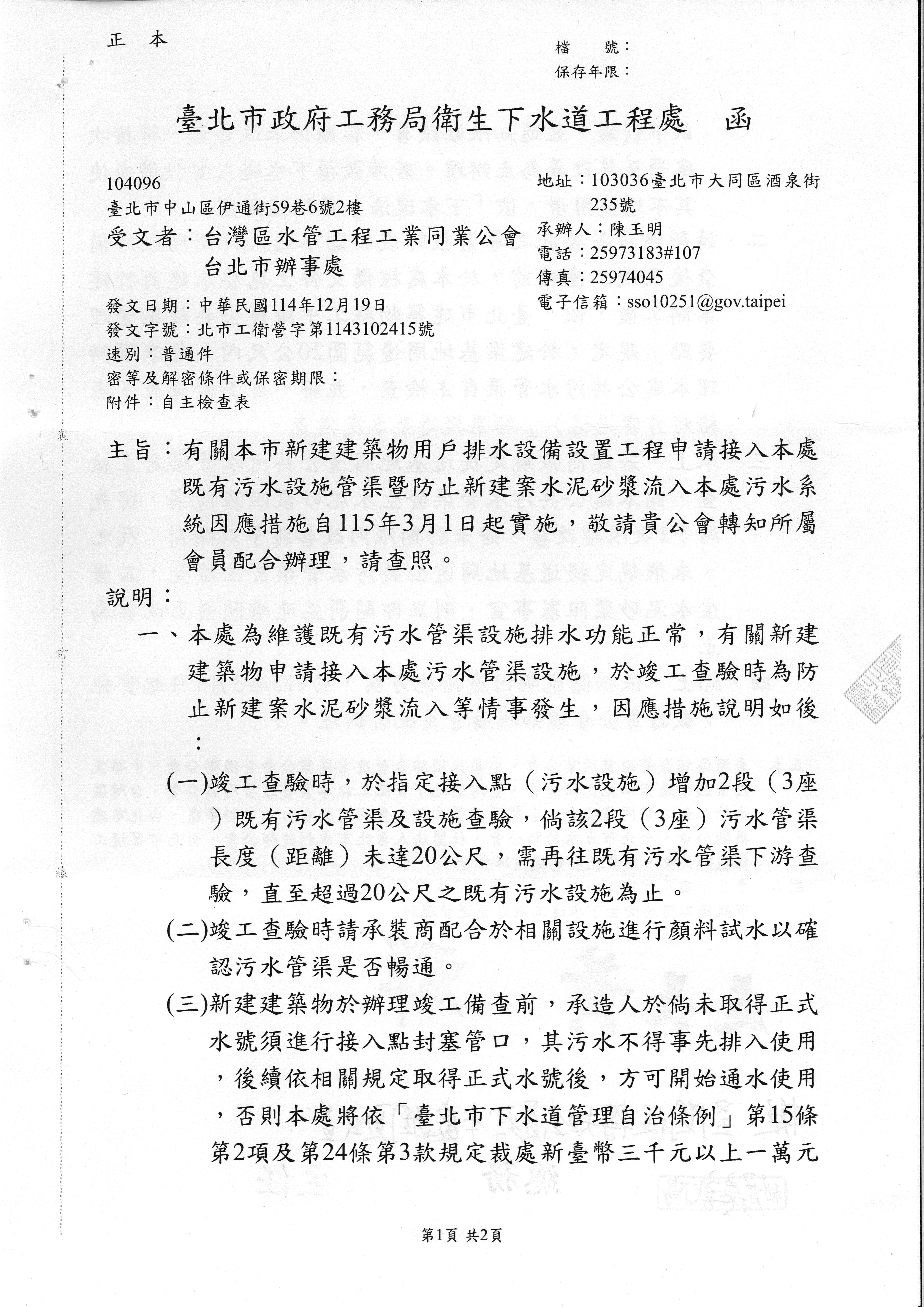 有關本市新建建築物用戶排水設備設置工程申請接入本處既有污水設施管渠暨防止新建案水泥砂漿流入本處污水系統因應措施自115年3月1日起實施